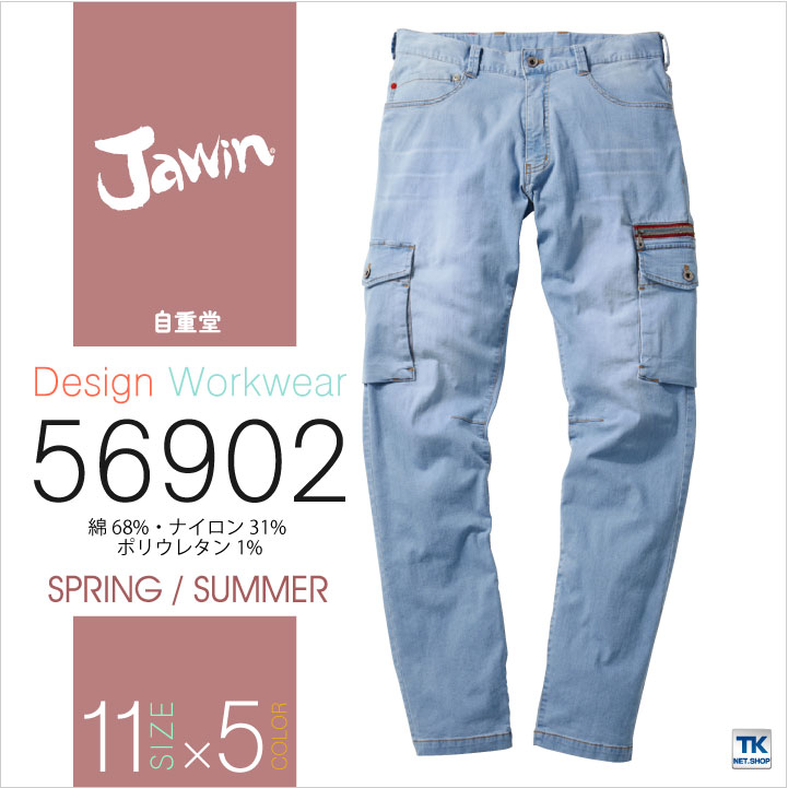 自重堂 Jawin 56902 ストレッチノータックカーゴパンツ 商品の特長 接触冷感機能糸を使用し、伸縮性に優れた ストレッチデニム素材を使用。