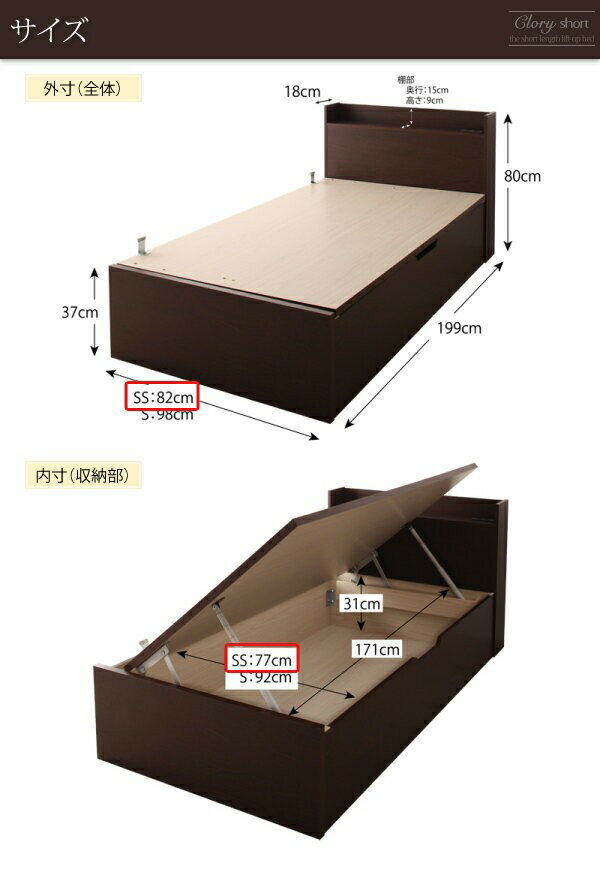 商品名セミシングルベッド 一人暮らし コンパクト ショート丈 SS 小さい ミニ 省スペース マットレス付き 跳ね上げ式ベッド ガス圧 ベッド下 収納付き 大容量 短い 小さめ 宮付き ヘッドボード 枕元 棚 ラック 携帯置き ティッシュ置き メガネ置き リモコン 頭上 収納 コンセント ゲーム ケーブル スマホ 充電 電気 北欧 おしゃれ モダン アンティーク商品バリエーション要組立 薄型標準ポケットコイルマットレス付き 横開 セミシングル ショート丈 深さラージ全バリエーション商品説明【サイズ】本体最大外寸セミシングル:(約)199×82×80cmシングル:(約)199×98×80cm床から床面までの高さ:(約) 37cm収納部有効内寸セミシングル:(約)171×77×31cmシングル:(約)171×92×31cm【材質】プリント化粧繊維板【耐荷重】全サイズ共通(約)180kg【その他】2口電源コンセント(1500W)【生産国】日本【カラー】//【重量】 セミシングル:(約)67kgシングル:(約)72kg【梱包サイズ】セミシングル:(約)4X84X39cm・3kg、86X187X7cm・29kg、80X64X20cm・12kg、182X35X8cm・15kg、88X19X83cm・12kgシングル:(約)4X98X39cm・4kg、105X187X8cm・3kg、98X33X20cm・12kg、182X35X8cm・15kg、100X11X83cm・14kg※各サイズ、重量は概算になります。