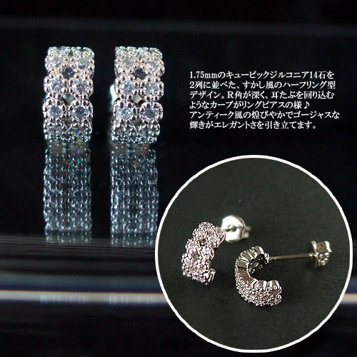 商品詳細 商品説明 クリアのキュービックジルコニア(1.75mmサイズ)14石を2列に並べアーチ型曲線のデザインです。