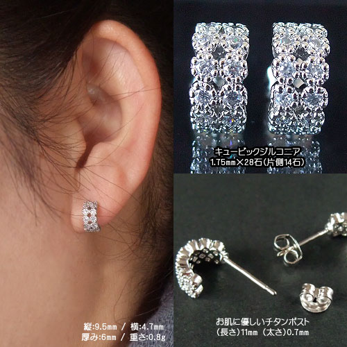 (金属アレルギーには個人差がありますので、掛かりつけの医師にご相談ください) 本体サイズ 縦長:9.5mm × 横幅:4.7mm × 厚み:6.0mm 重さ:0.8g(片側・キャッチも含みます) ジルコニア:1.75mm(片側14石) ポストサイズ 軸長:11.0mm × 軸径:0.7mm(やや細め) 素材 真鍮(本ロジウム鍍金)、チタン(ポスト部分) キュービックジルコニア(人工石) 配送方法 ・クロネコ宅急便(宅配便):○ ・ネコポス便(追跡可能メール便):○ ※ご注文ステップの配送方法にてお選び頂けます。